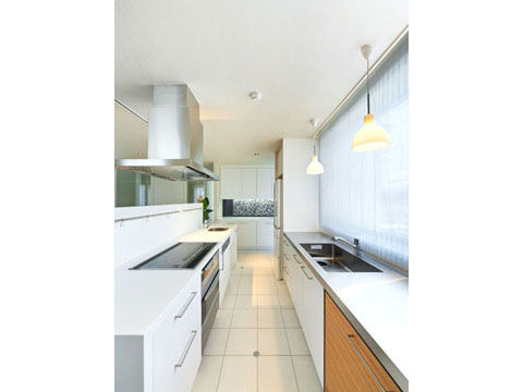 家事室 奥のガラスで囲まれたスペースは脱衣室。
